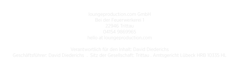 Alle Grafiken, Logos, Texte und Bilder sind Eigentum der jeweiligen Firmen oder von loungeproduction.com und dürfen nicht, ohne ausdrückliche Einwilligung des Inhabers weiter verwendet werden. Links, die auf externe Angebote Dritter verweisen, führen zum Verlassen unseres Internetangebotes. Irrtümer Vorbehalten.
